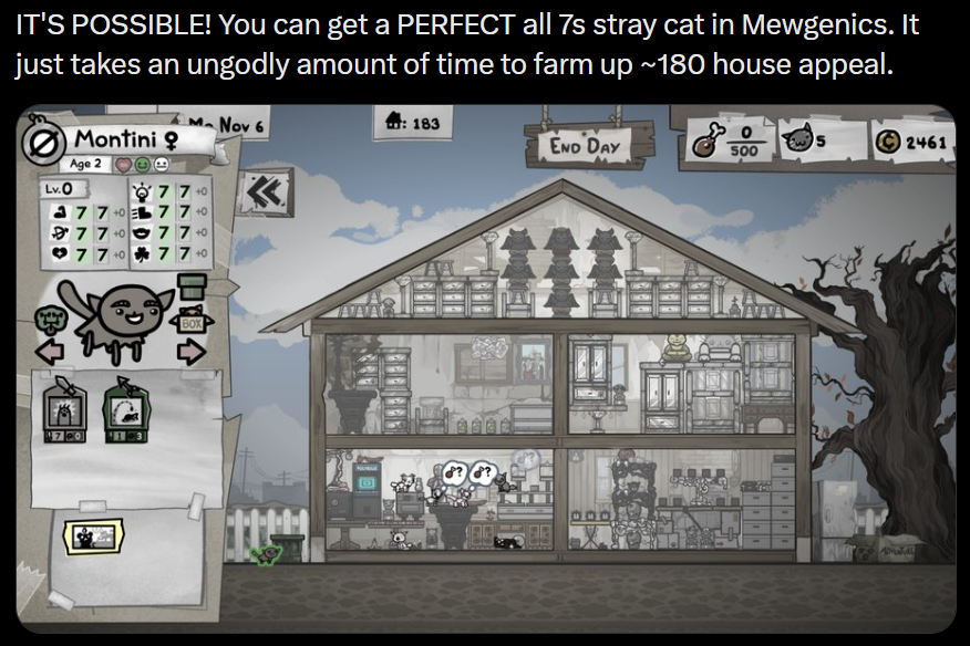 >>733725005I deliberately picked cats who already fuck like rabbits. It takes a few hours, but throwing away the cats without the mutations I want and making harem rooms for my desireable mutations gets me more hits than not. That's how I have dice eyes on multiple cats and other mutations like the long neck that increases range>>733724949I could be wrong, I saw someone mention it before too, but they could have been wrong. 12 is my highest though and this would be cancer cat#3 and 4