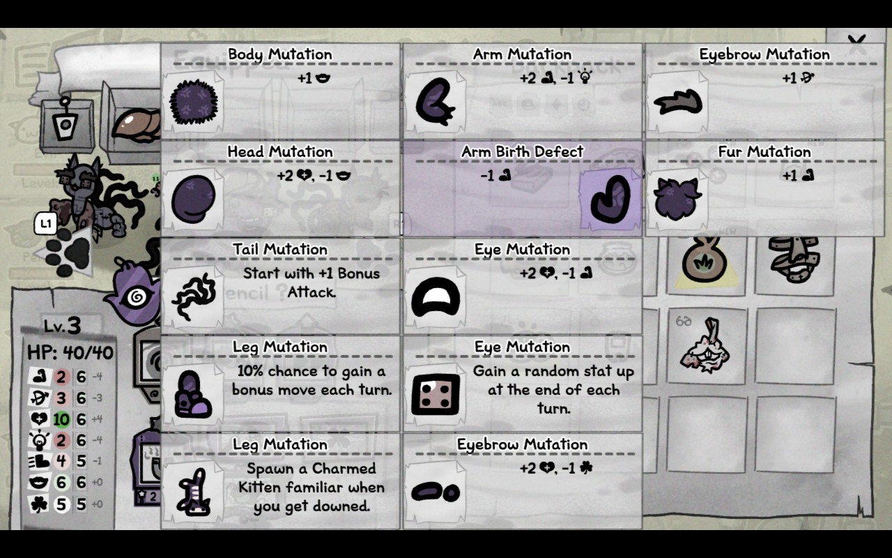 Mutations capping out at 12 and overwriting each other really fucking sucks. Had to leave after Boris because I didn't want to eventually lose a water movement mutation that makes all water movement zero after losing a 2nd bonus attack mutation and a fucking counter mutation from overwrites on my cat with 12 mutations.. On another note, Mage with latent energy is really strong. Even with it slowly turning into a chimeric monstrosity, it ended up being my biggest damage dealer. Look at these monstrosities