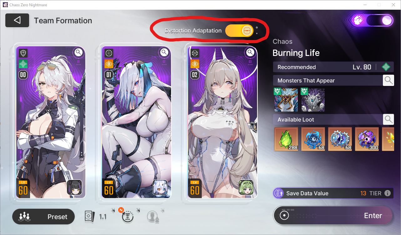 None. It's legitimately just a goated feature. You can save and use the save data you make with Distortion Adaptation in content outside of Chaos all the same.