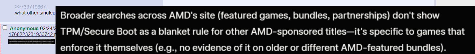 >>733719889No, SecureBoot is the exact opposite, and even if it wasn't that's what the TPM is for.These games don't need your permission to be rootkits or even SecureBoot to be on for such. Look at the old Street Fighter V launch or Riot Vanguard prior to 2026. It's mostly a compatibility thing, entrusting all people that did the humiliation ritual of turning it on are on the same playing field. Even for a single-player game, I can imagine more stuff just asking you to turn on SecureBoot the same reason why you would "need" Windows 11. Pretty much the only reason it isn't on by default is because it's kinda new tech.Now, a single-player game asking for your phone number is REALLY FUCKING STRANGE no matter how you slice it.