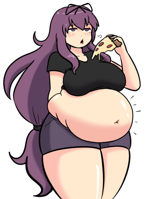 Feeding Murasaki pizza to make her belly catch up with her boobs.