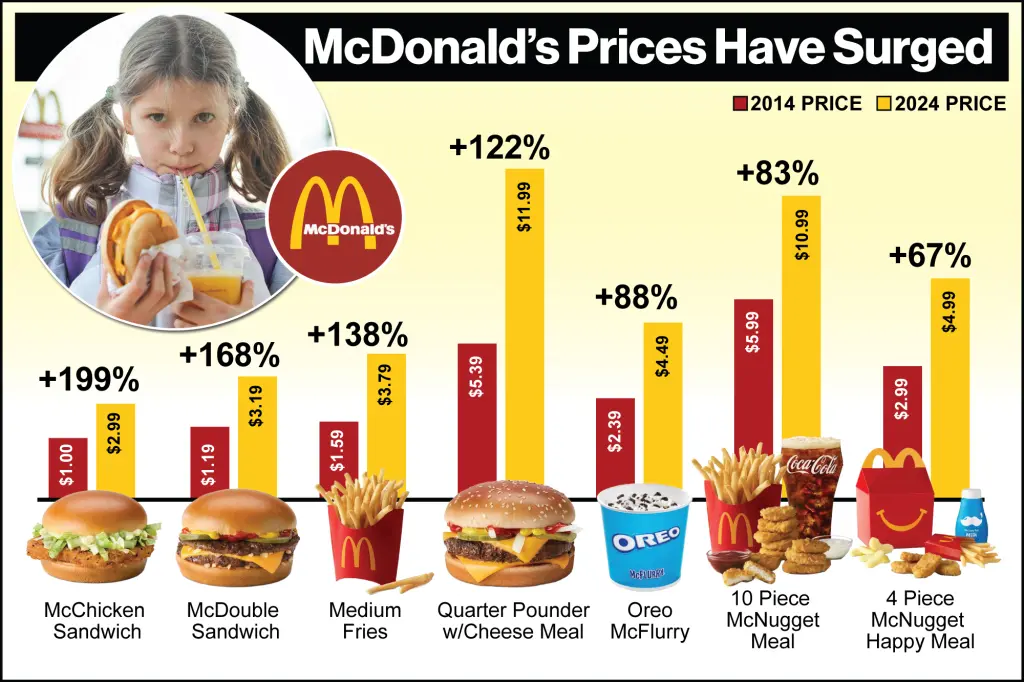 >>733720923As long as there are retards who pay the prices won't go back down. It baffles me that people still eat McDonalds when it's both more expensive and worse quality than most other options.