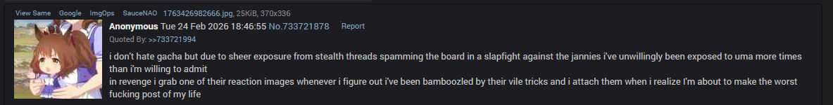 One day he got banned and I swear to god every single bad post in that thread disappeared. It really is mostly one guy that fucking hates us for some reason and has been schizoing out for months
