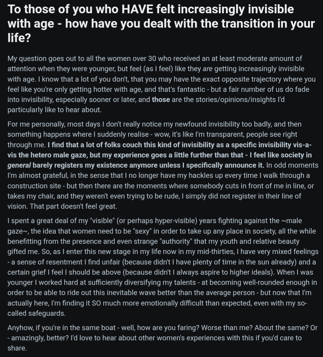 >>733769070Sad, though I feel like I've aged nicely and look more manly in my 30s and get more attention if anything.The absolute worst is when women transition to men. There was this one alt model/cosplayer I'd follow called Nosferaboo who, while not traditionally pretty, got a lot of attention online for being a girl. They transitioned and their whole "career" died immediately. Suddenly they had to deal with the fact that society does not care about men that way and will not try to pick you up if you display fragility. It's such a shock.