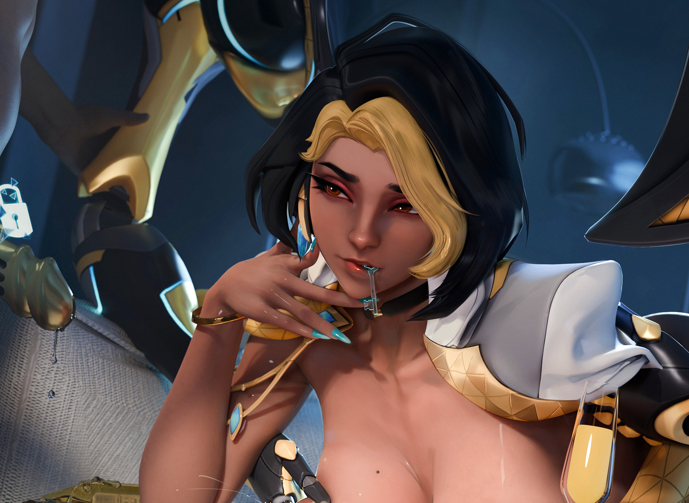 >Blender anim where Domina and Her husband approach an Overwatch girl at a bar and take her to their hotel room. Domina watches as her husband ravages the girl and participates a bit, giving her husband playful slaps on the butt when she wants him to speed up his thrusts, holding the girl's head down when she tries to come up for air, and using all 4 arms to play with herself while she watches her husband ravage their guest. Husband tires, and just as girl thinks they're done Domina takes his place with a hard light strap-on. Cue series of creative positions enabled by excess arms. Next morning. Domina and husband are getting dressed in hotel bathroom. Complete professionalism between the two, nothing about their behavior hints at last night's depraved display. Camera follows them as they leave the bathroom and walk out hotel room. It lingers on the door before turning around and panning to the bed. On it is the other girl, blindfolded, ball-gagged, and bound with rope. A note on her bag to the cleaning service to enjoy the little gift.>The end
