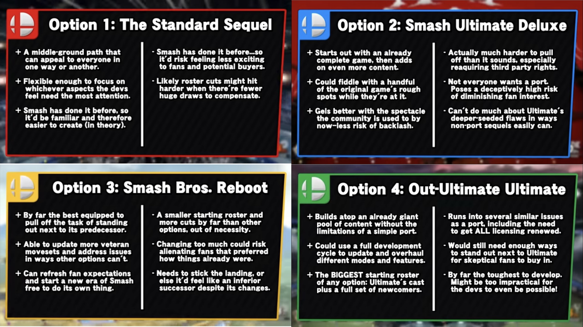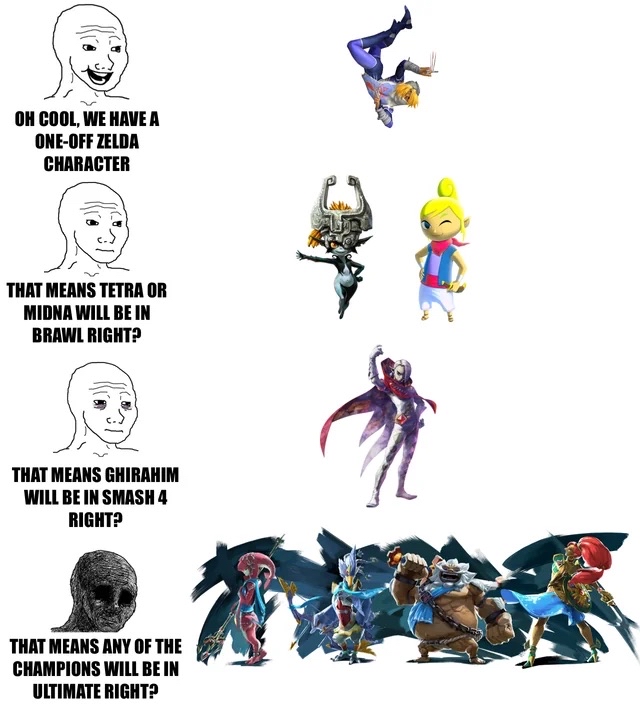 Most retards I hear seem to think the logical next game would cut about 80% of the roster and make up for that by re-making ganondorf and sonic.