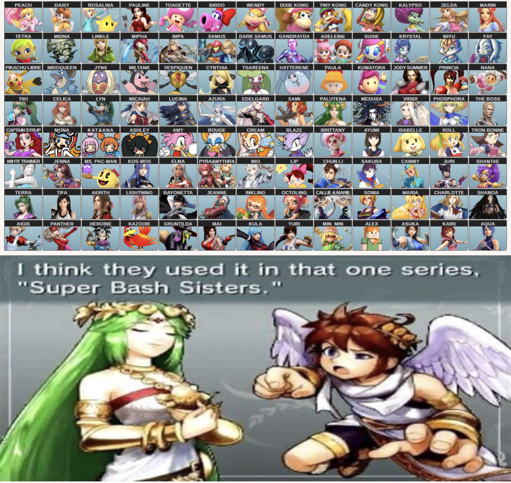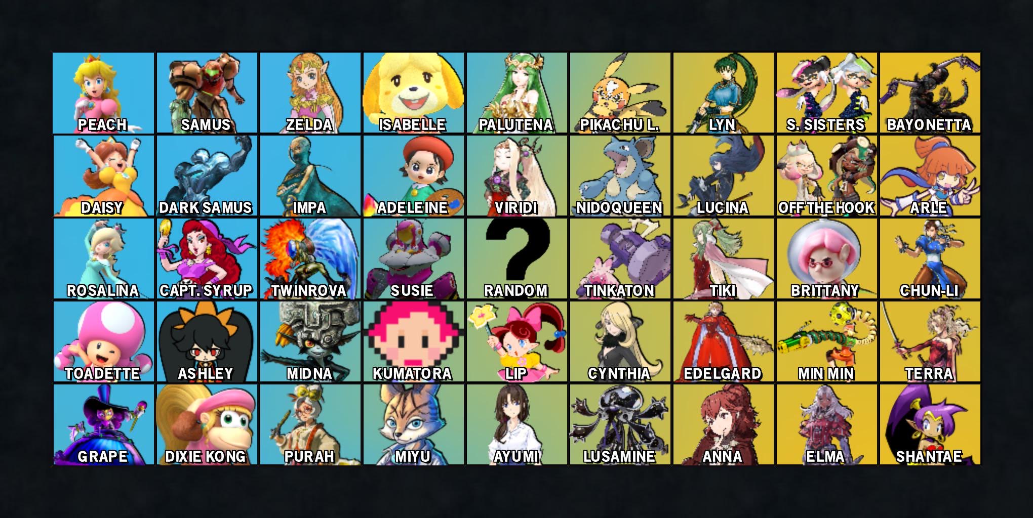 >>733779583Super Bash Sisters Roster, here are some things worth noting It’s crazy how the only full female 3rd party character we’ve ever had in Smash is Bayonetta. Yeah even I forget she exists.I picked Miyu over Krystal because Miyu fit the spacie archetype better. That and I really don’t like Krystal’s design. Fight me!As a Fire Emblem fan, I notice that most fan rosters heavily base the FE lineup off of who’s already in Smash, (which isn’t great considering FE has one of the worst fighter selections of all series in Smash) and the newcomers are just characters like Alear due to recency bias. Also I didn’t include any characters with gender options, that means no avatars since this is a female focused roster. Avatars are dumb, always saw them as cheap cop outs for female representation from FE.