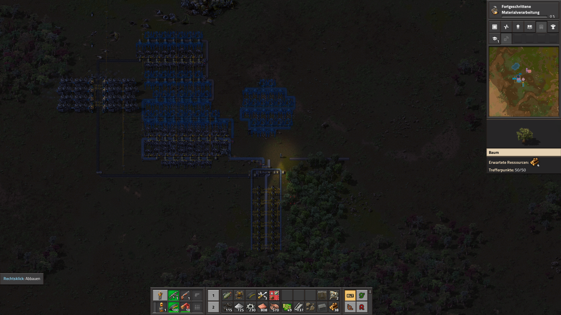 Hmm ... I unlocked electric mining drills and I want to create a proper smelting setup. Let's see. They spit out an iron ore every 2 seconds? So that's 0.5/s. And my smelters they take 3.2 seconds to smelt an ore? Hmm, how does this fit together? Well, I need to transport ore, so let's work with the yellow belts. They transport 15 items per second, was that it? So if a miner takes 2 seconds to create an item, that means I need double the amount of miners! 30 miners to fill a yellow belt. I just put them all in a line and make sure it's roughly above 30 miners!And I can do the same calculations with my smelters. 3.2 times 15 = 48.This is not that hard. If I always calculate backwards - what I need to produce to fill a belt and then forwards, what I need to feed into a factory to produce a fully filled belt, I can calculate the perfect ratios! And Factorio always tells me what a machine produces every second, so I don't need to calculate crafting time times crafting speed to get the final result! When I started I confused these two terms!