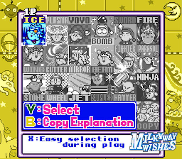 the first time i beat Milky way wishes in kirby superstar, i always paused the game to use this menu to pick a new powerup. But in the bosses the pause menu is disabled, but you can still pick a powerup using the X button.I beat Marx using just regular kirby because i didnt knew this.