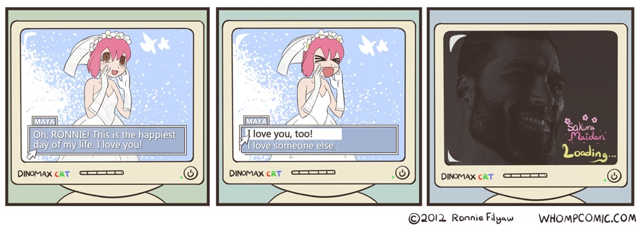 >>733754143>>733754528>>733754784>>733755831I've been following and just waiting for a Ronnie thread anywhere on 4chan to give my hot take.What we do know from before his WHOMP hiatus and depressive psychotic break is that he got some Asian girlfriend or maybe was simping and thought they were dating, doesn't matter either way they broke up during covid or something and his other projects were nonstarters and he just couldn't make Whomp anymore.The design for this new girl is just so deliberate and intentional. Ronnie would never give the girl these piercings just from his imagination. She just has to be based on a real person. Then he makes her look just like Ronnie and effortlessly in love with him, a nod to her being the perfect woman for Ronnie.Real Ronnie totaly got a girlfriend and is simping hard... or at least I sincerely hope he did and it's not a Megan Schroder situationWishing the best for Ronnie and that this doesn't blow up in his face