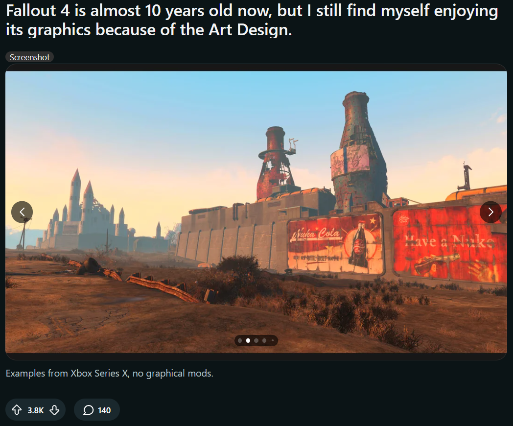 >>733759391I think Fallout 4 was the first Fallout I didn't like the graphics ofAnti-soul fog made everything blue,modular armor was gay (like all modular-things in every game ever),all the clothes were too form fitting and gay, the material used for them in their 3D modeller was gay, I felt like every other piece of clothing was for a modest woman to wear like they prototyped unisex clothes but only wanted to look at the female model when designing them,the objectively superior combat rifle with its high damage, DPS and plentiful ammo, looked bad, sounded bad and felt bad,they couldn't draw a GOAT test this time but sure could remind you it existed, haha 'member when???and everything from the retrofuturism to the nuka cola bottles were so toyish and manbaby minded, even the nuka girl cheesecake felt out of place