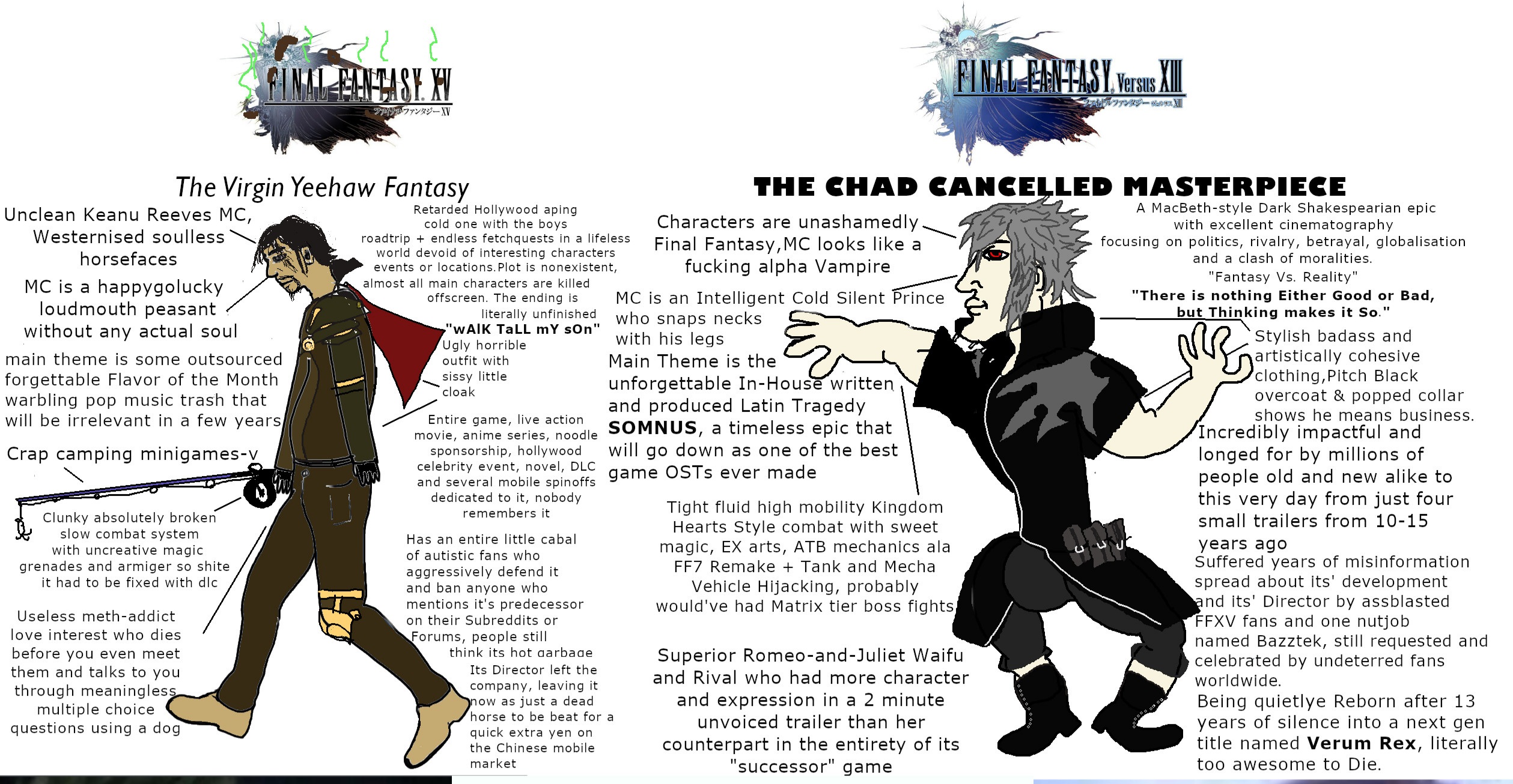 >>733757530>We only saw so little of it, it probably barely even existed.Debunked for multiple reasons:- the plot of most final fantasy games are subject to change up until release, versus XIII was no different. This didn't mean there was not a general story outline- Roberto Ferrari raging on his Facebook account that most of the storyboards he had made for versus XIII did not make it into XV- Nomura announcing in a Dissidia livestream that drawing noctis again "brought him to tears" and that he had a restriction on talking about Versus XIII until recently - multiple names at Square Enix stating that the original Versus tale was quite different to XV- Nomura has repeatedly said in early interviews that Versus was much closer to his true style than Kingdom Hearts, aka a pure passion project- Nomura keeps putting Noctisgrams in everything he works on recently (That grey haired side character in FF7R, Young SephirothH in FF7R Ever Crisis, Yozora being a literal clone with a 1:1 copy of a Versus XIII trailer in KH3s secret ending) making it clear he the director does not see Versus and XV as the same thing at all>It was scrapped for a reason.Because of problems with the crystal tools engine being designed around FFXIII and not translatable to a Kingdom Hearts ARPG like Versus XIII, and also because Square higher ups needed someone to direct FF7 Remake and put Nomura on that instead. Nomura had no issues directing any of the other 6+ Kingdom Hearts games or producing Crisis Core and TWEWY while he was directing Versus XIII. >Given all of the other shit square enix has pumped out, you don’t really think it would’ve it have lived up to your expectations do you?I do because dark macbethian kingdom hearts FF without the Disney filler is pure kino and all I've ever wanted from a game. Nomura is a godtier director chained to proprietary disney stuff and Remakes and has never once gotten to make his own thing like Yoko Taro.