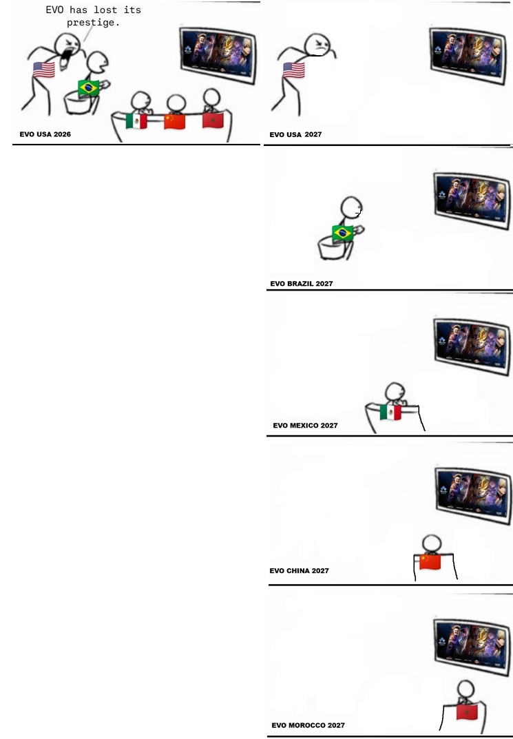 >>733774165The brackets will be 95% the people in your region you play online against every day, and the remaining 5% will be top players who can afford to travel to every single EVO tournament... because they're going to win it and get that sweet, sweet Saudi oil money.>and the winner of EVO Brazil is... Leshar / Blaz / Xiaohai!>and the winner of EVO Mexico is... Leshar / Blaz / Xiaohai!>and the winner of EVO China is... Leshar / Blaz / Xiaohai!>and the winner of EVO Morocco is... Leshar / Blaz / Xiaohai!