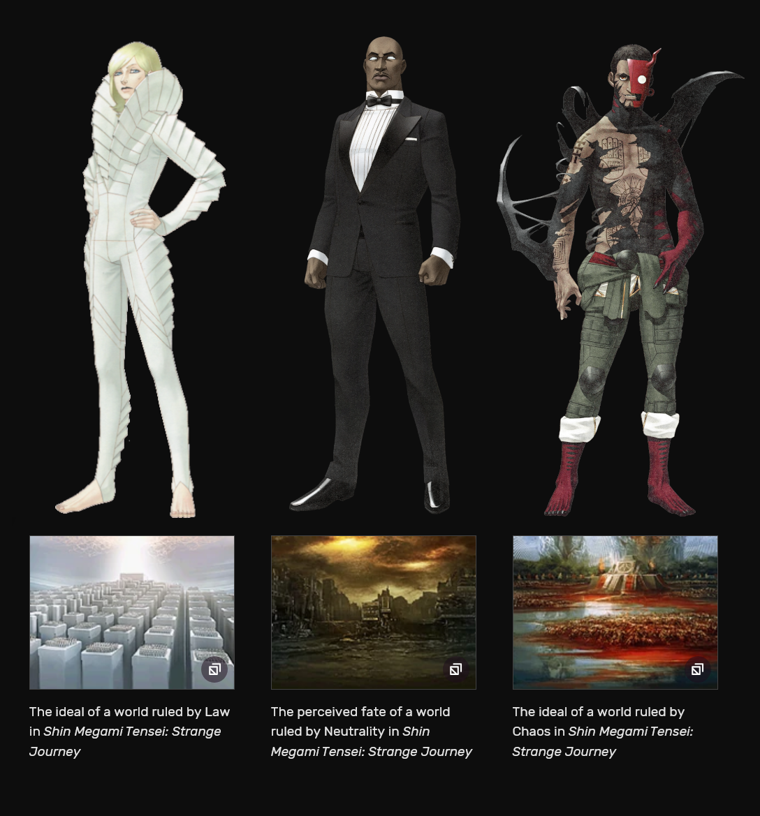 >>733777196Nah, fuck both law and chaos, humanity always wins in the end no matter how bad things can get. The best ending in 3 is the neutral ending because of that, you spit on kagutsuchi and lucifer and force the world back to normal, it's great.