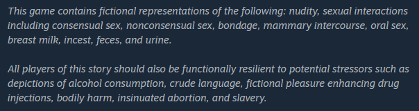 >>733795751Nearly every VN to have been banned on Steam over the past few years has been because of all ages but suggestive/ecchi content involving characters Valve doesn't like being submitted to Steam for Valve to review. Stuff like Angelic Chaos, Eve of the 12th Month, Raillore, Amatsutsumi, Holy Undead, DT2 and 2-2, and so on all got submitted without any porn to Valve, but the review team blocked them.That said, Valve will allow literally anything if they don't object to the character appearances, see Sleepless.