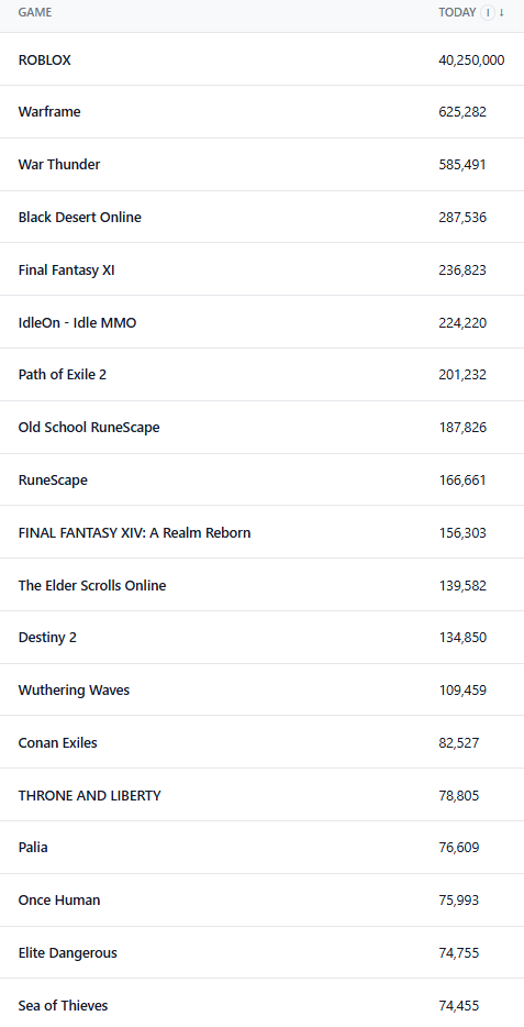 >>733813785>not even mmosthen here's a list of mmo pop consistency (30‑day stability of engagement)>>733813925>Source?its from here: https://mmo-population.com/its the most accurate mmo pop list out there from what I see