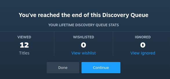 man, has the discovery queue always sucked? I used it specifically for the Next Fest, almost 2000 titles, and I barely managed to get about 50 games the amount of shit I skipped simply because of AI thumbnails was insane