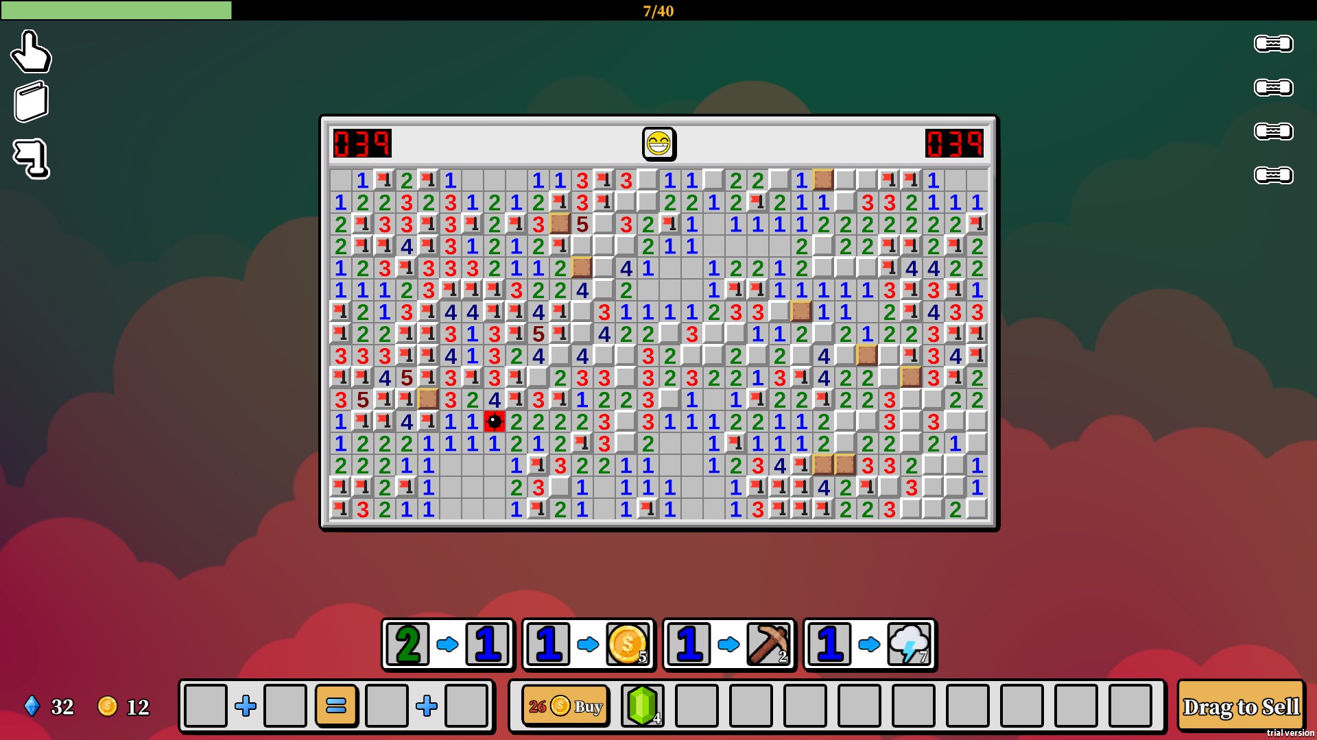 >>733896272The game description makes it sound like there would be a lot of build variety to play around with but honestly a lot of the Skills are useless, like there's absolutely no reason to use 4,5,6,7,8 as skill triggers when they rarely occur compared to 1 and 2s. Neither is there any reason to create skills that activate on clicking a mine when doing that kills you. Of the skills that allow you to open multiple tiles at once, you really only need the lightning (random tile) and pickaxe (random adjacent). The rest of the skills are directional while these skills will always work as long as there is an empty tile. With the increased Gold and XP meta boosts, fishing these two skills is very possible in a run.The only interesting thing is that you may want to do is to chain 2>1 and maybe even 3>1 like in this pic. This setup causes opening 1, 2 and 3 tiles to automatically uncover 8 other safe tiles and the effect will cascade if those happen to be 1, 2 or 3 too. The game is almost solving itself at this point.