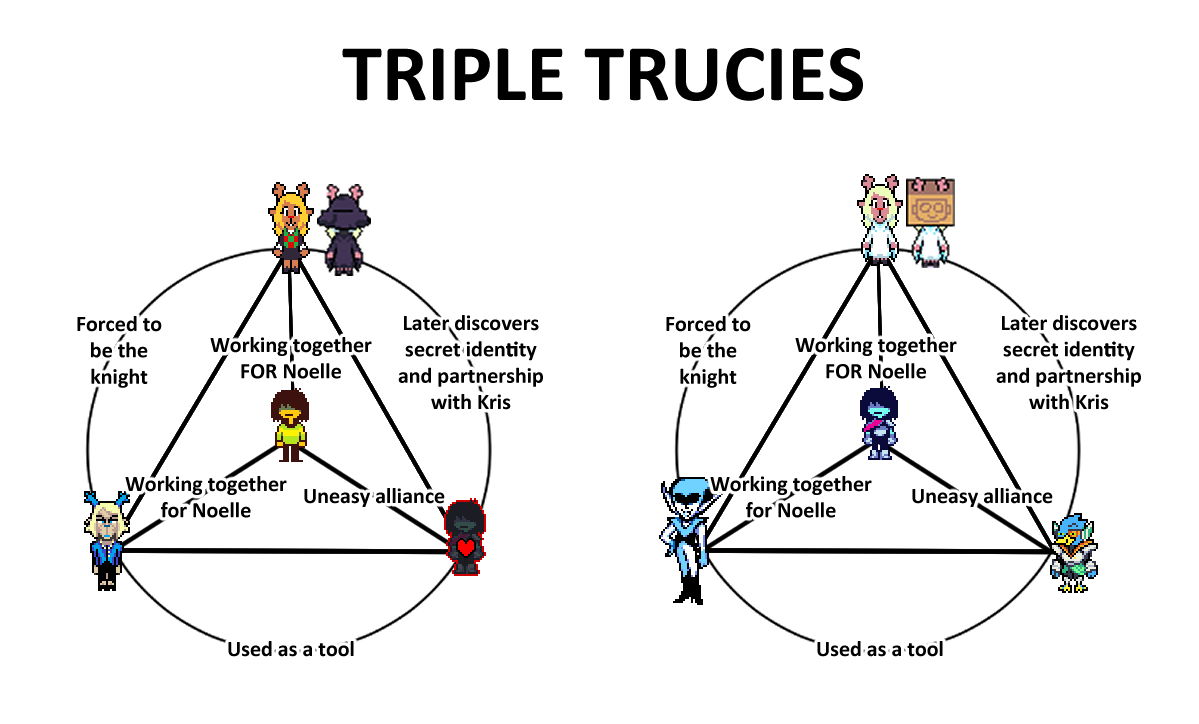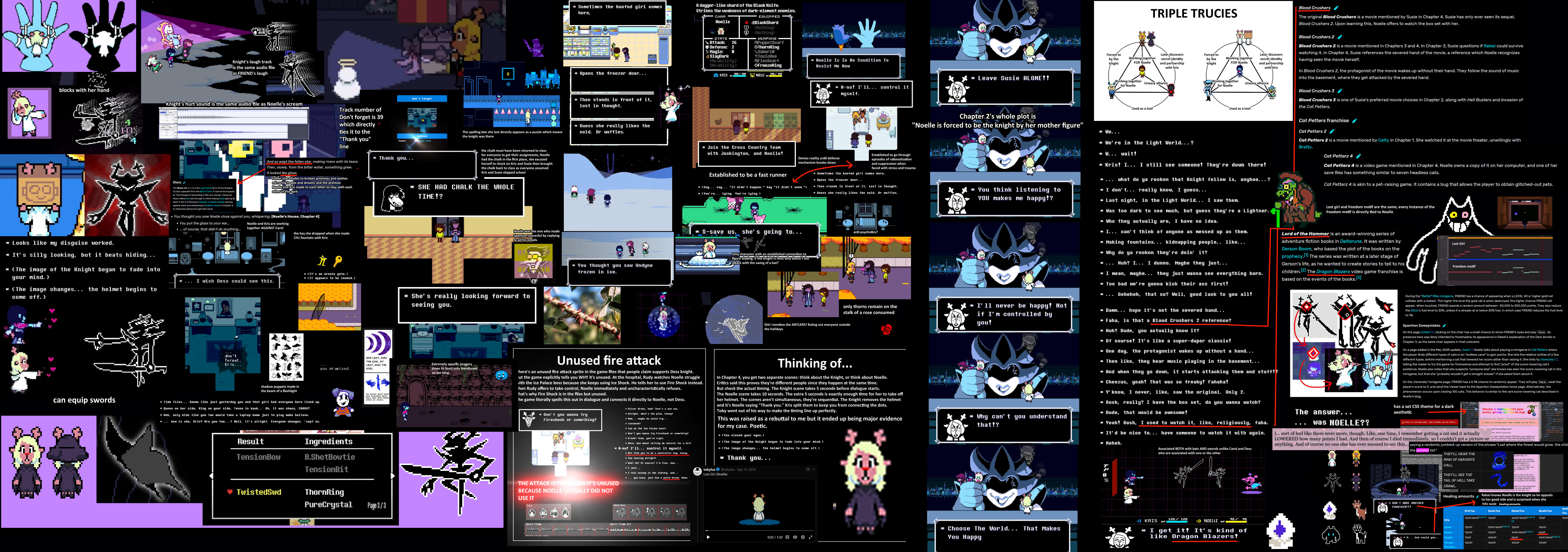 Noelle is not the Knight, but I understand why people have reached that conclusion. See, some people have realized, intuitively, that the Fun gang, or atleast some of the members of it, will fight Noelle in the future, problem is, they haven't actually realized how why this will happen. They think it has already happened, with Noelle being the Knight, but no, it hasn't, Noelle it not the Knight. But It will happen, and here is the reason:The final tragedy involves The Girl killing some of the heroes, it is likely that The Girl teams up with The Human to fight The Monster and The Prince, now, originally, The Girl was Susie, and The Monster was Noelle, but the conspiracy has made it so that the roles have switched, and Noelle is now The Girl, with Susie taking the place of The Monster. This is the whole point of the conspiracy, to craft a different intepretation of the prophecy so Noelle can be saved, and Susie will serve as the sacrifice. This is the reason why Noelle will fight the Fun gang. Well, actually, let's be honest, it's not gonna happen in the Normal route, there is no way Noelle would agree to it, Kris will probably change his mind too, but it will probably in the Weird route.