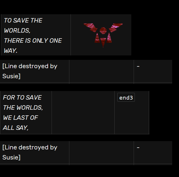 >>733869919If the final prophecy is instead something like "Fallen to the knight, the girl must lay" this would allow for:-The girl to be also the knight-The final prophecy to unfold without death and instead Noelle accepting the role that's given to her which is what Carol wants-The roaring to be averted without death while the Angel is still met with its desireThis is what I think Carol's plan is, but Susie getting in obviously ruins all that.This is also why Ralsei is so scared of the roaring, because he thinks Susie will die when it happens. I think Ralsei probably made a promise to keep Susie safe when they were alone together in CH2 which is why Susie puts most emphasis on Ralsei after seeing the final panel.Think about it, Susie learns she's a legendary hero in the prophecy only for that to mean she has to die.This also adds another layer on the CH4 ending if we think the caller is Noelle. The screen is split into two, pink and gold, as Susie mutters about not letting the final prophecy happening. Two girls who have crushes on each other are forced into roles that destine them to kill each other.