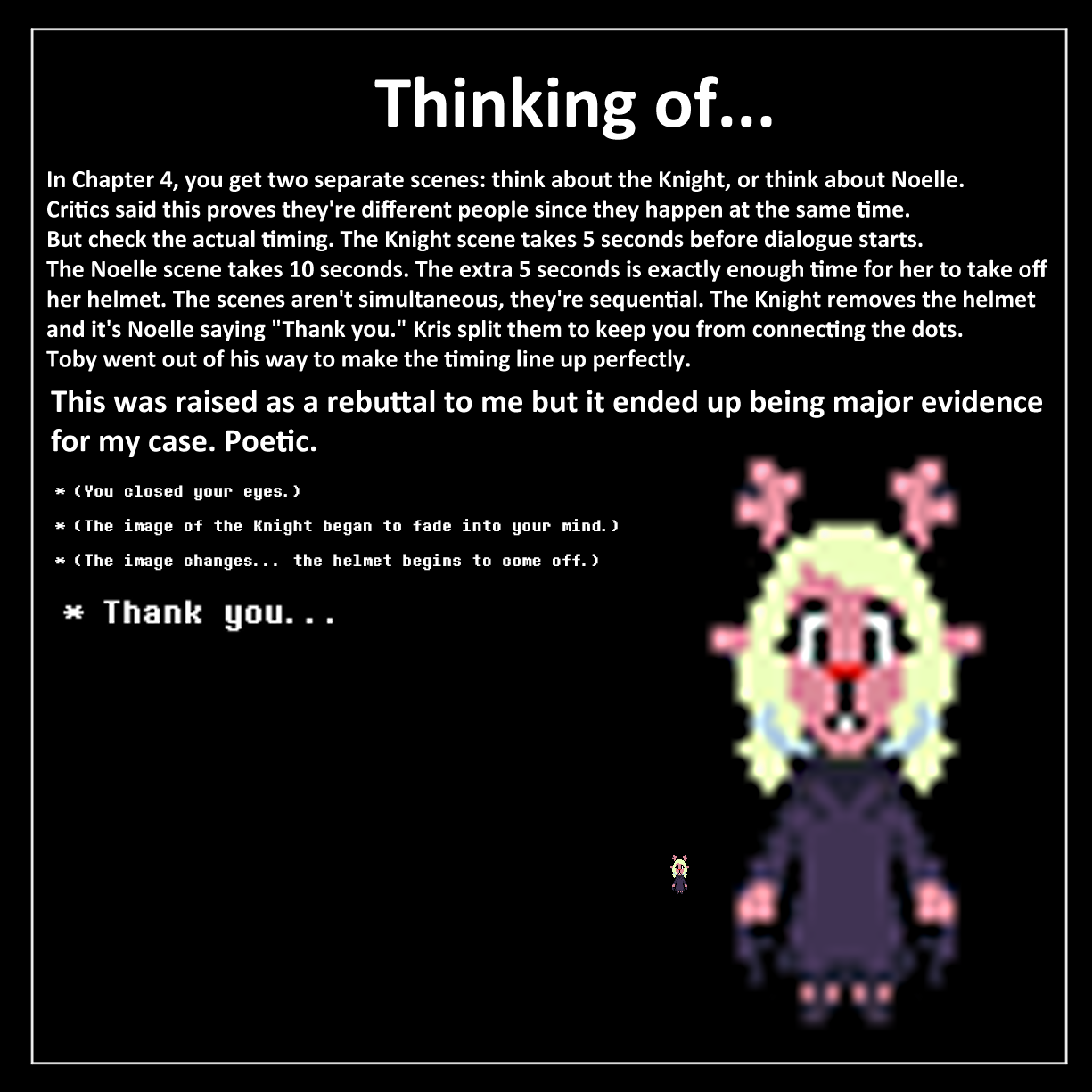 >>733883597Thinking of the Knight or Noelle shows you the same person. There's a reason the game doesn't actually SHOW you her like it does with Susie.