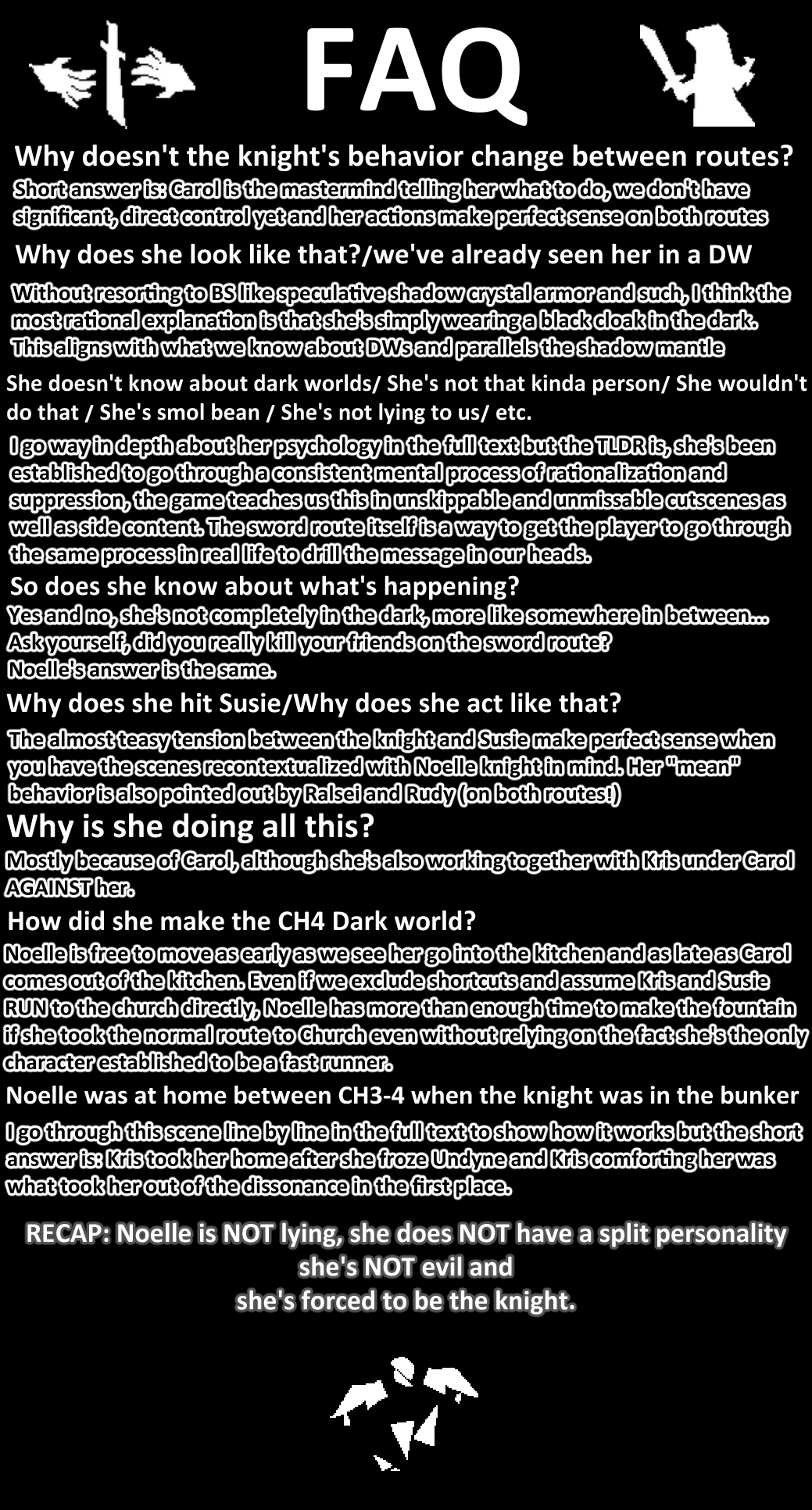 >>733879182If you're interested in the case, read it.If you want to debunk it, present your case, read the FAQ first at least though.If you're interested in neither then why bother engaging?>everything in this doc will need to be addressed in-game for it to be true. Do you really think that's going to happen?Everything is taken from the game with minimal speculation, going as far as to avoid things like shadow crystal armor and Gaster almost every knight theory rely on in favor for more grounded explanations that tie back to things we've seen in game.