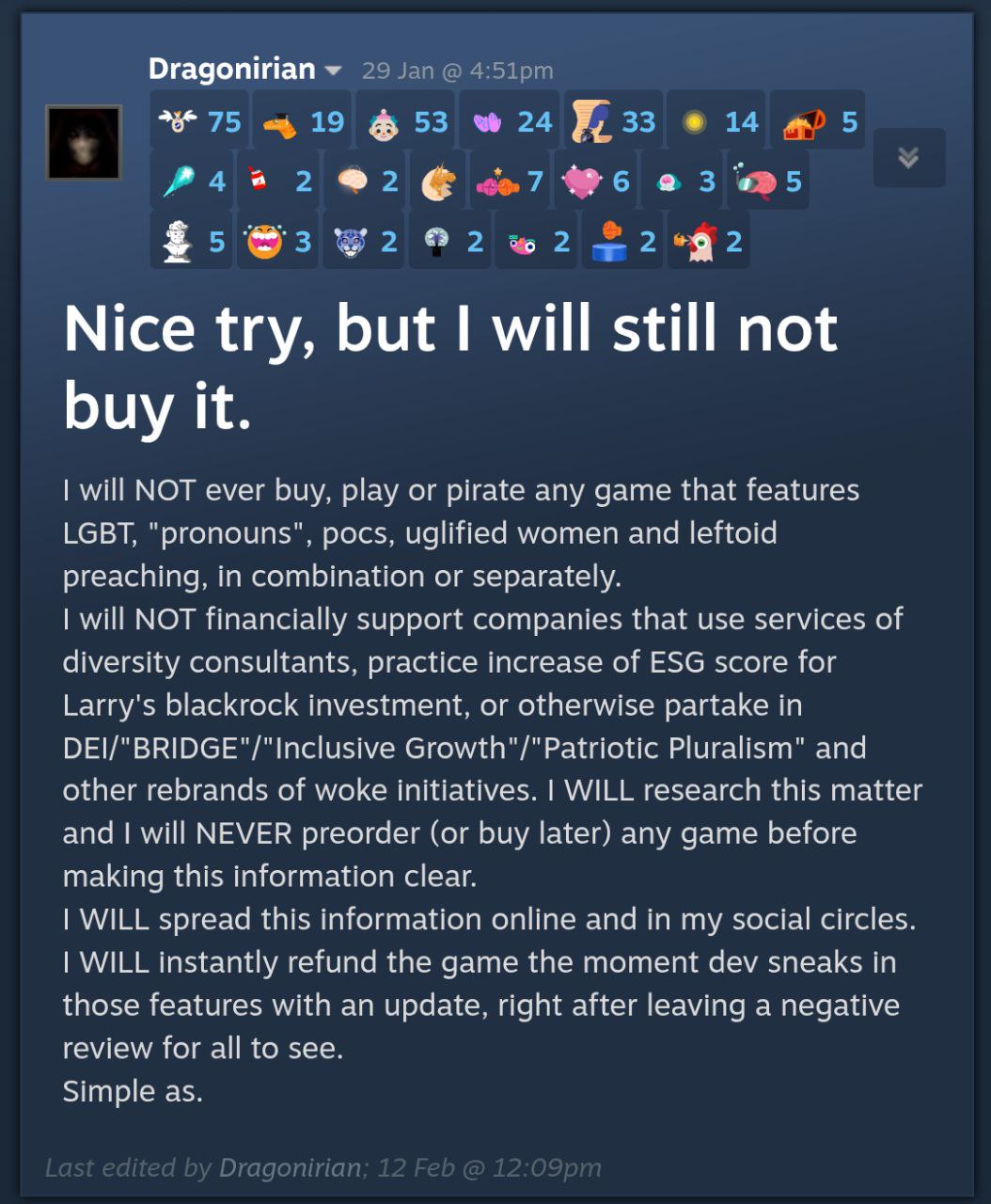 >>733892623>I made threads boasting about my preorderI don’t care about this game, but I still think you’re retarded. At least you got your money back, good for you. Please don’t preorder games anymore, it’s not worth it. Don’t let fomo or social pressure influence you so much.