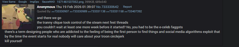 >>733905779Yes, I despise the whingey faggots that seem to make up 90% of this board, which is why I only come for next fest threads as most people are here to actually play games