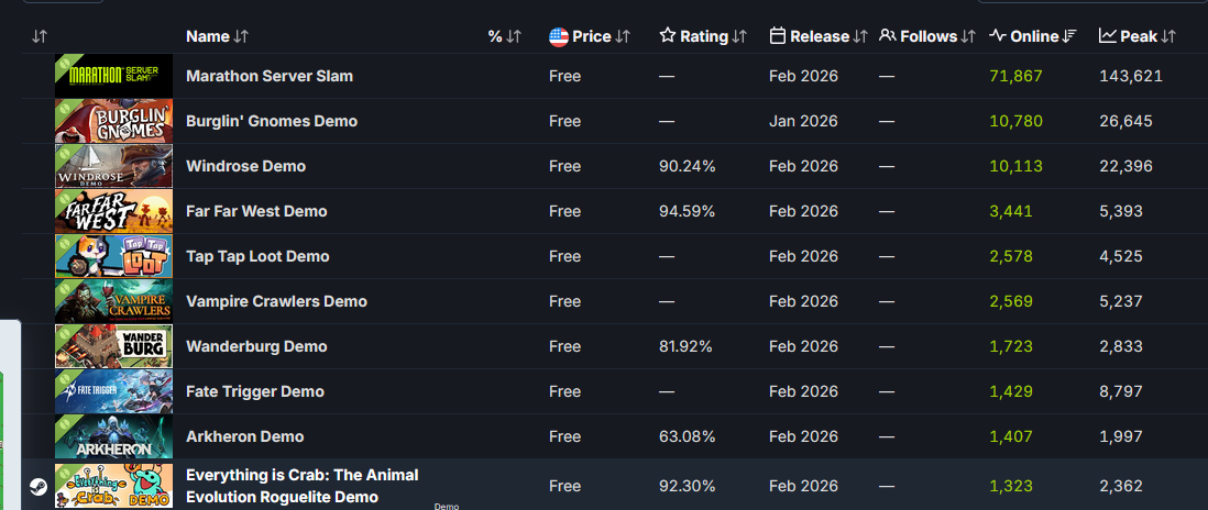 Favorites so far:https://store.steampowered.com/app/3848440/Mimic_Sleuth/>casual puzzle gamehttps://store.steampowered.com/app/2411200/Underkeep>beautiful pixel art dungeon crawlhttps://store.steampowered.com/app/3819690/Nox_Mortalis_Demo/>kingsfield + gothic