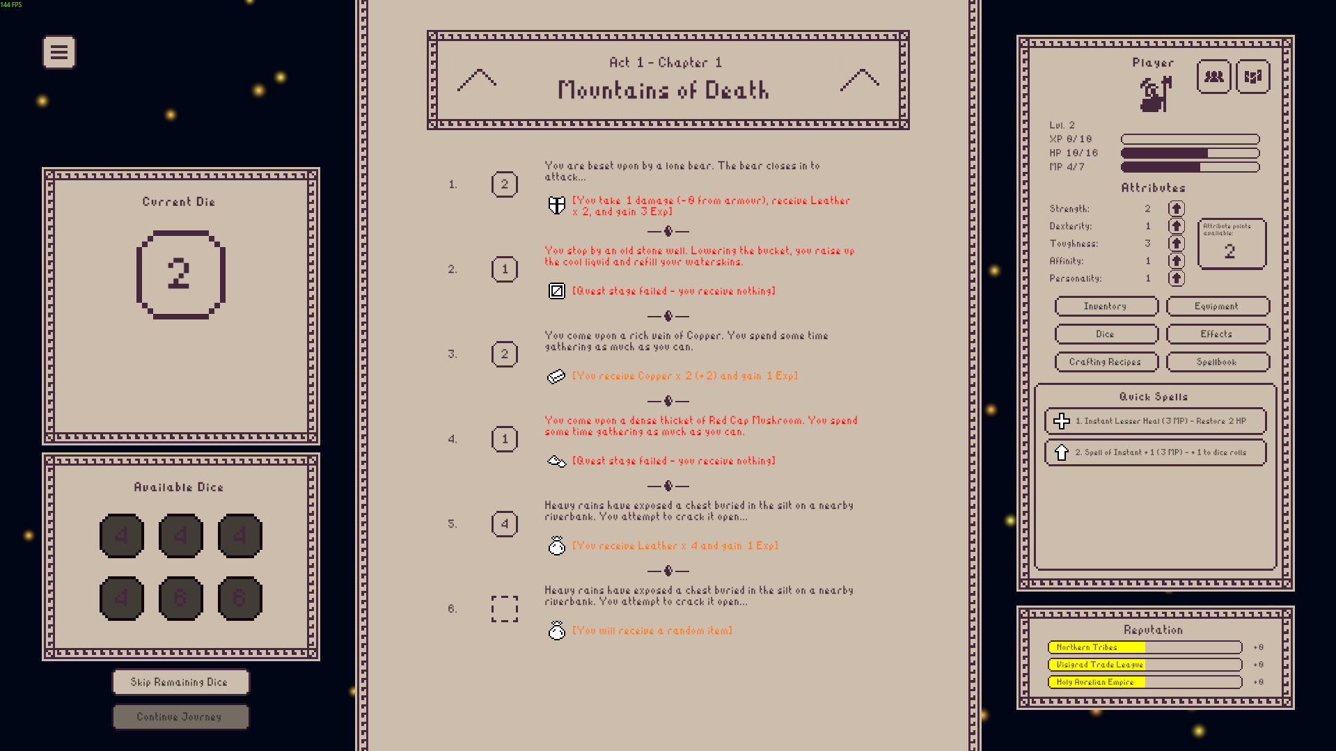 Dice Odysseyhttps://store.steampowered.com/app/4093860/Dice_Odyssey/Roguelike with slay the spire level progression. Start with a few dice for each encounter, roll them, and slot them into "quests" to see if you succeed and how well. Unclear why I kept failing some quests - e.g. I would slot in a die higher than the # it said it wanted for combat and would occasionally just fail it and take full damage and get no XP. Text is also really fucking small for some reason. Don't think I'll be playing the full game after beating 2 acts to end the demo.