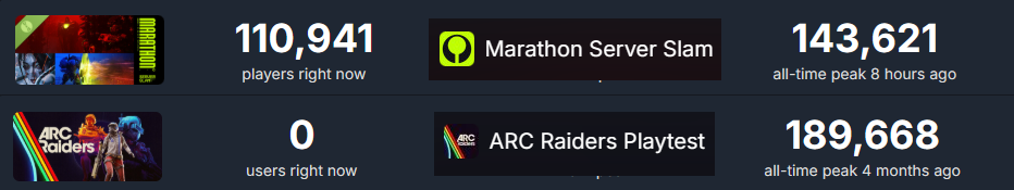 >>733906094how re9 is growing right now and arc is above 100k. players aren't sleeping, marathon is just a shit game