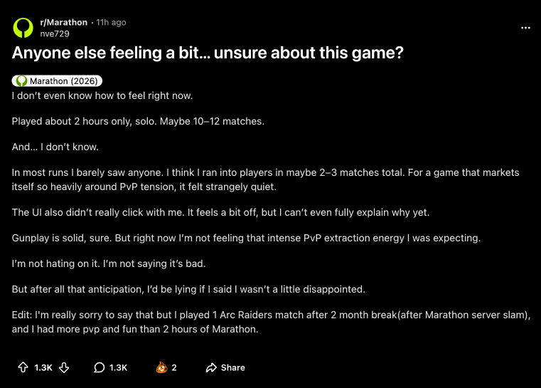 >Marathon lost 50% of it's players in just 12 hoursWhat went wrong with Concord 3?