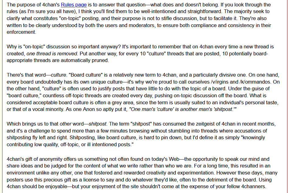 >>733932246Gamergate is a somewhat complicated answer that can mostly be derived from Moot not wanting *yet another* gayops headache to deal with, I think; do recall that Gamergate was fresh, FRESH on the heels of 4chan getting in a lot of trouble from the Fappening, marking 4chan beginning to turn into a 24/7 parade of political activism from ignorant neckbeards. Though the cuckoldry had a lot to do with it too I think Moot precognitively smelled that Gamergate was going to turn into a twisted nexus of bitching about feminism and SJWs and was ultimately right to can it off of 4chan for as long as he did, along with just being tired of 4chan and wanting to move on to being a Google sysadminIf you want a community that glows which the mods actually did foster, look at the sharty, a bizarre tumor grown off of /lgbt/ and /qa/ in equal measure which the mods tolerated for as long as they did because they had dreams of soijakkers being their own private army. Unfortunately soijakkers are still tumors and turned against their own, on top of Cobson edits marking where the premise became unfunny for unfunny's sake instead of being Le Agents Of Chaos