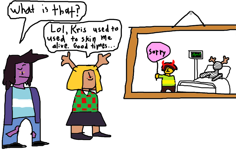 Toby Fox, today I plead, do not make me regret purchasing your game.Reveal that the current sprites are "overworld sprites" and show a scene in which Susie is not built like a fridge and has some feminine shapes and Kris is a handsome dude.Do not pull the rug under us in the weird route.End the Kris pronoun discourse that often plagues the game's discussion (regardless of whether or not I mention it here) by letting him be the him that he deserves to be.