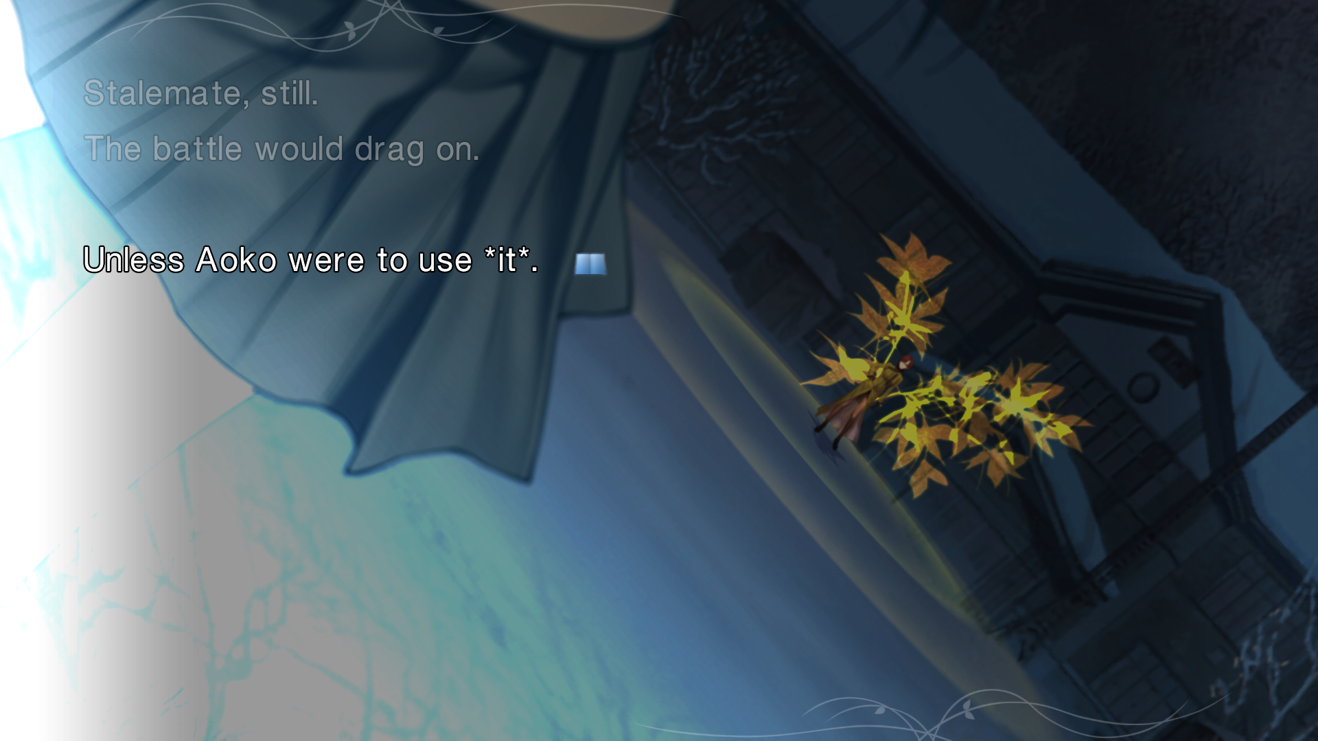 >>733989789There really should be an alternative Akiha ending where she ends up possessed with Roa like in Kohaku's route and ultimately represses him like in Kohaku's ending, but with her being placated with Shiki's love.