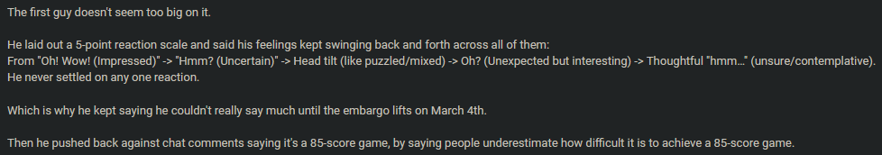 https://www.youtube.com/live/sbRln6BBb_Q?t=7880sMax didn't like the game...https://www.youtube.com/watch?v=TLRqTE7CCd4&t=60sTesters thought it was the worst game they ever played...