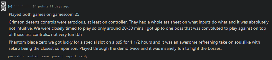 >>734053521I think phantom blade looks fun. I'm okay with games that go with souls/nioh/sekiro controls. maybe we could get more variety from devs if people didnt start sperging out when they dont get the same exact game over and over again. I recall streamers crashing out to ninja gaiden 4 because oh no you actually have to take some time to learn a new control scheme