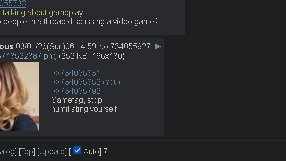 >>734050357>>734050431>>734050464>>734050515>>734050564>>734050621>>734050657I don't get it, the internet is full of emoji using normalfag cattle now who are responsible for mtx and gacha games existing and unironically upload pictures of their faces as their internet avatars. I have nothing in common with any of the people in these comments, why am I supposed to care about these opinions