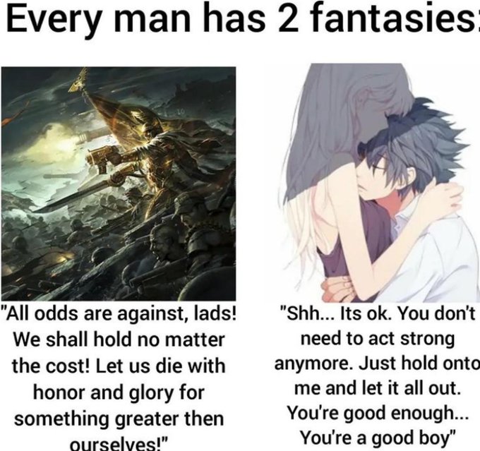 >>734097812as is the role of husband in a traditionally if it came down to it. But if the choice is between dying gloriously, and dragging all of you out of there even if it's shameful to run away from the glorious death you crave, there IS a right choice.>>734097883and yeah honestly getting her to open up again after that loss, and accept not only loving but being loved again, and then making her lose that again. Not everyone believes there are fates worse than death, so let me ask you, are you simply more afraid of being the one who loses her, or do you really think she'll be better as someone reforged and then broken again, worse than she ever thought possible?