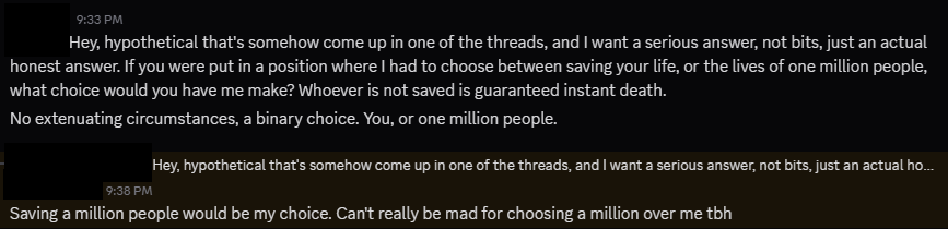 I liked the part of the last thread where a bunch of people actually seemed to agree that having your own self-sacrifice be denied would suck, that was first time I've seen that happen around here.