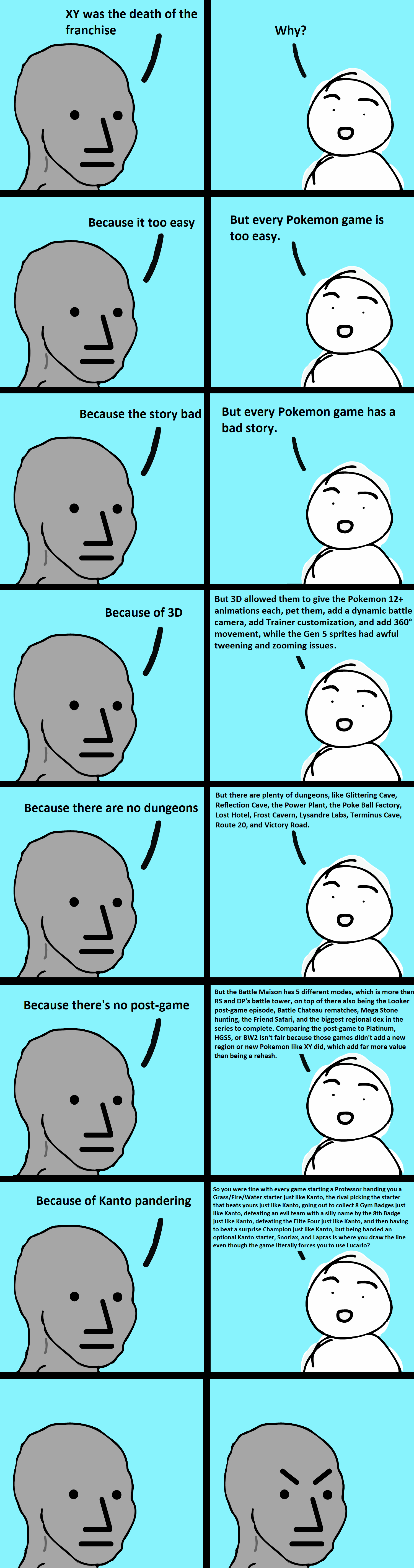 >>734099671It is too easy, even compared to the rest of the series. There's not even one remotely challenging battle.The story is bad, even by Pokémon standards, especially when it's clear they tried in the last two gens.The 3D is bland. Most animations are boring and unrealistic based on the species. Sure most attack animations are cool, but the static animations are too plain. Plus tbe games had frequent lag drops in any battle with more than two Pokémon out at once.There are dungeons but all except for Terminus Cave were mediocre. All were really simple with very few split paths. You can complete the Looker story in like two hours. The Battle Maison is so easy that I managed to beat the whole thing (beating all Chatelaines and getting all possible rewards) in about 10 hours. There's plenty of other side activities but most are really simple and bare bones. The game only has about 80-90 hours of content and more than half of that is beating the main story.Yes I'm fine with the games following a similar formula. That is not pandering. Pandering is when they show love to one thing at the expense of another. The Kanto starter you get from Sycamore overshadows the Kalos starter due to the fact that it can Mega Evolve.