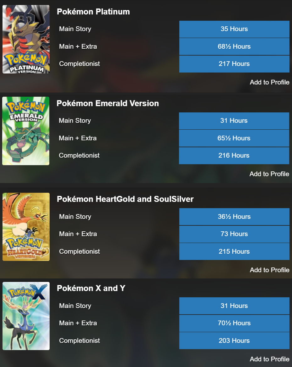 >>734101368>that's every pokemon game x2And they're all different levels of easy.>and yet somehow they interrupt you less than the retards in gen 5In terms of individual times, maybe. But overall time, no.>It's literally one of the longest games in the series content wiseNot really. I can complete EVERYTHING in like 80 hours. I don't know why HLTB says 200+ I honestly have no idea what took them so long. Shame HLTB doesn't require proof.>RS and DP didn't have battle frontiers and the PWT in BW2 is complete dogshit because it has no difficultyNo but they had a third version that had one. If the PWT has no difficulty then the Maison has negative difficulty.