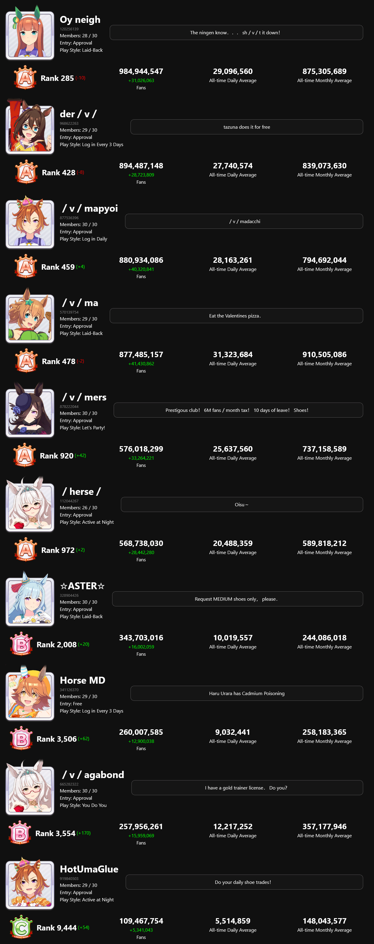 /v/mapyoi has led two members to eternal rest and now has two vacants>Look up the club in-game and please put "/v/" on your profile's comment beforehand, you can change it later after being approved. You can also leave your ID here>Our club has been A+ rank since a couple of months ago>We don't have any fan quotas but a level of activity is expected (careers, shoes, just play the game)