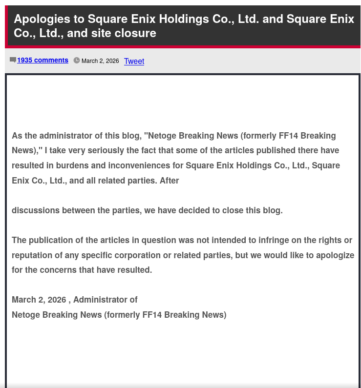 >>734133251APPARENTLY this relates to a 05/02/2026 post about the company's public finances,And APPARENTLY,The actual offense is from the anonymous japanese posters who APPARENTLY named company names and spoke about violence towards them.One must necessarily ask if any of this was manufactured by sqaure, given anonymous nature of posting on the blog website, past history, and how its oh so convienent.Never trust a fucking japanese salary man.