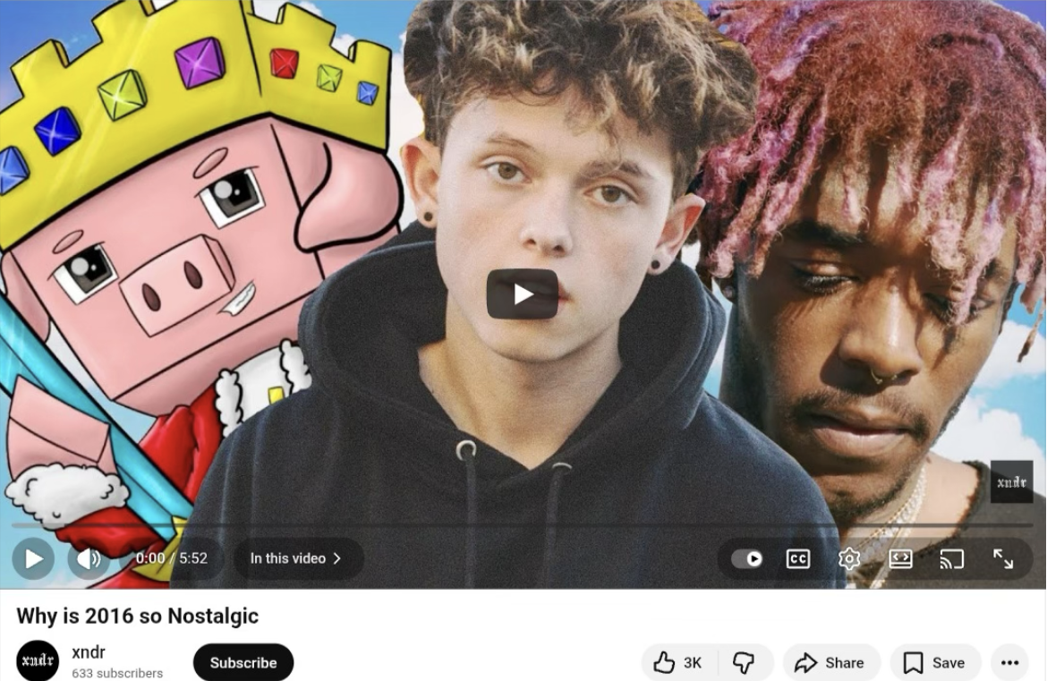 >>7342519202017 was a good year for games, 2016 was whatever. I can’t believe people are nostalgic for those Minecraft YouTube videos or Jacob Sartorious or whoever that specific African American gentleman is. I remember enjoying this a lot at the time https://youtu.be/dgha9S39Y6M?is=yxLd6LFr92vjhHPJ