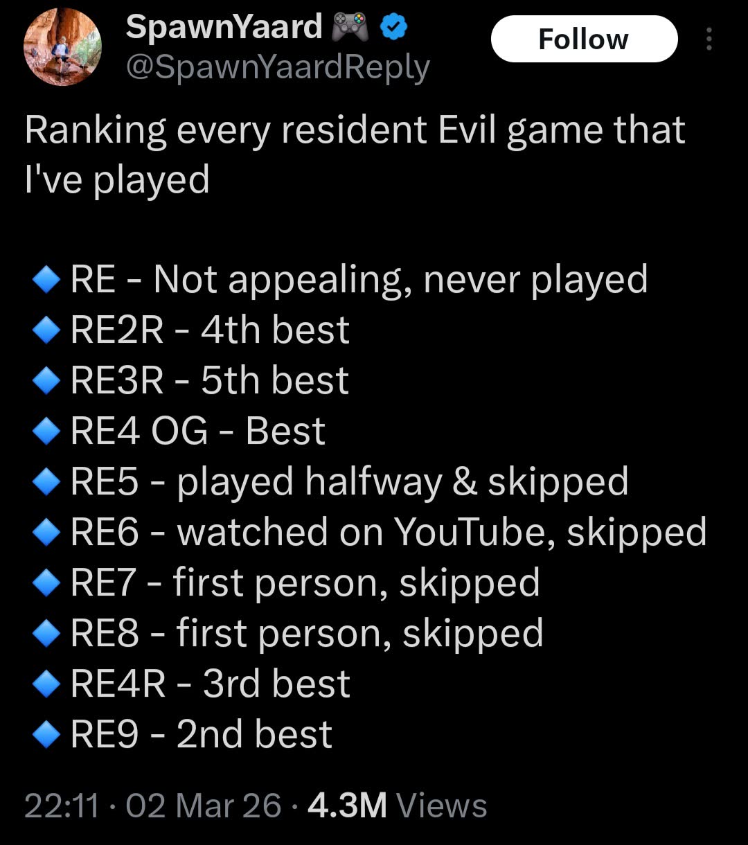 RE1 - pretty good but like REMake a little more2 - really good3 - pretty goodCV - need to actually finish0 - cool but I hate dropping items on the floor4 - outstanding5- Basically just multiplayer 4 so pretty good6- Absolute dogshit but the mechanics are okayRevelations - Very inconsistent but I like itRev 2 - Raid mode carries it7 - Pretty good8 - Pretty good with Mercenaries mode.9 - Good but too easy.