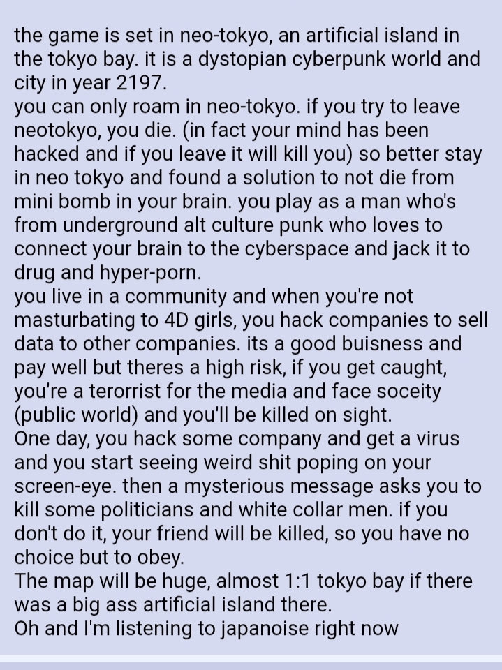 >>734335695What's the point?I'm just gonna start another project then abandon it soon after.>>734335793Just wait for another 2-3 years for AI musics.Otherwise fucking work a few months for the music if you trust in your project.>>734335841I'm tired of starting project & abandoning project.I just want someone to work together with so we can push each others to finish the game.But I can't find anybody like that.