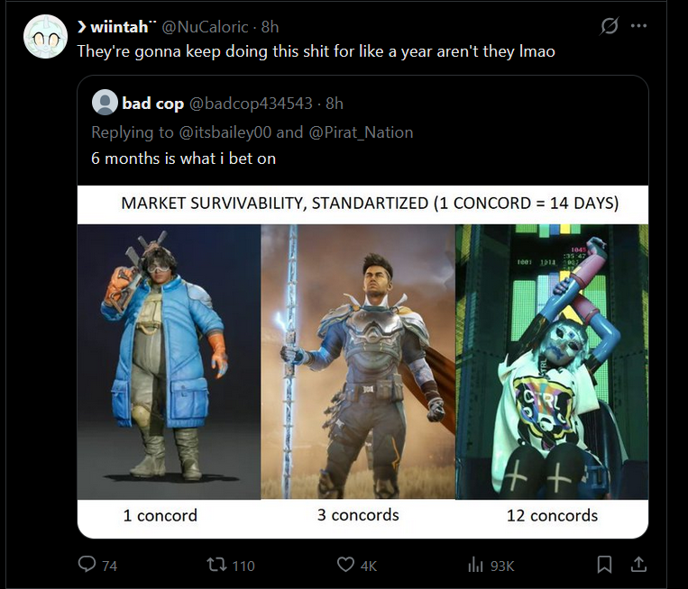 >>734357768Concord had less than a percent the players of marathon and highguard was free so made no moneyHope that helps you understand