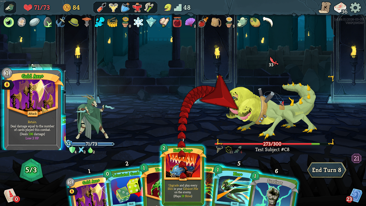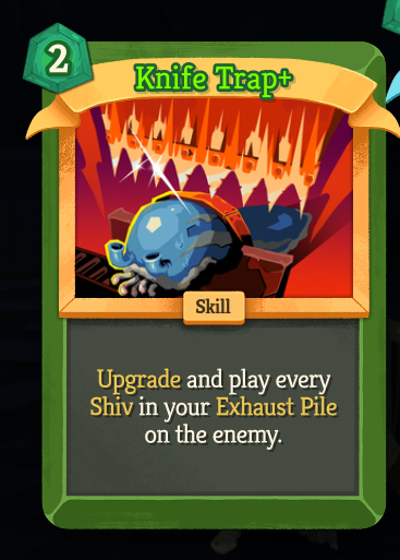>>734361669Just played a Silent run that was shivs + 2 serpent forms + this card. Was very strong but an event took one of my blade dances away, them immediately into the Act 2 boss who debuffed the absolute shit out of me. Kind of sorry I didnt save scum the fight because I'm sure there was a winning line. Exhausting shivs has really made me rethink when I play the card.I had a bunch of sly but very few ways to discard. I don't know if I was unlucky or if there's less now.>>734366267The game seems a lot more stingy with energy than 1.