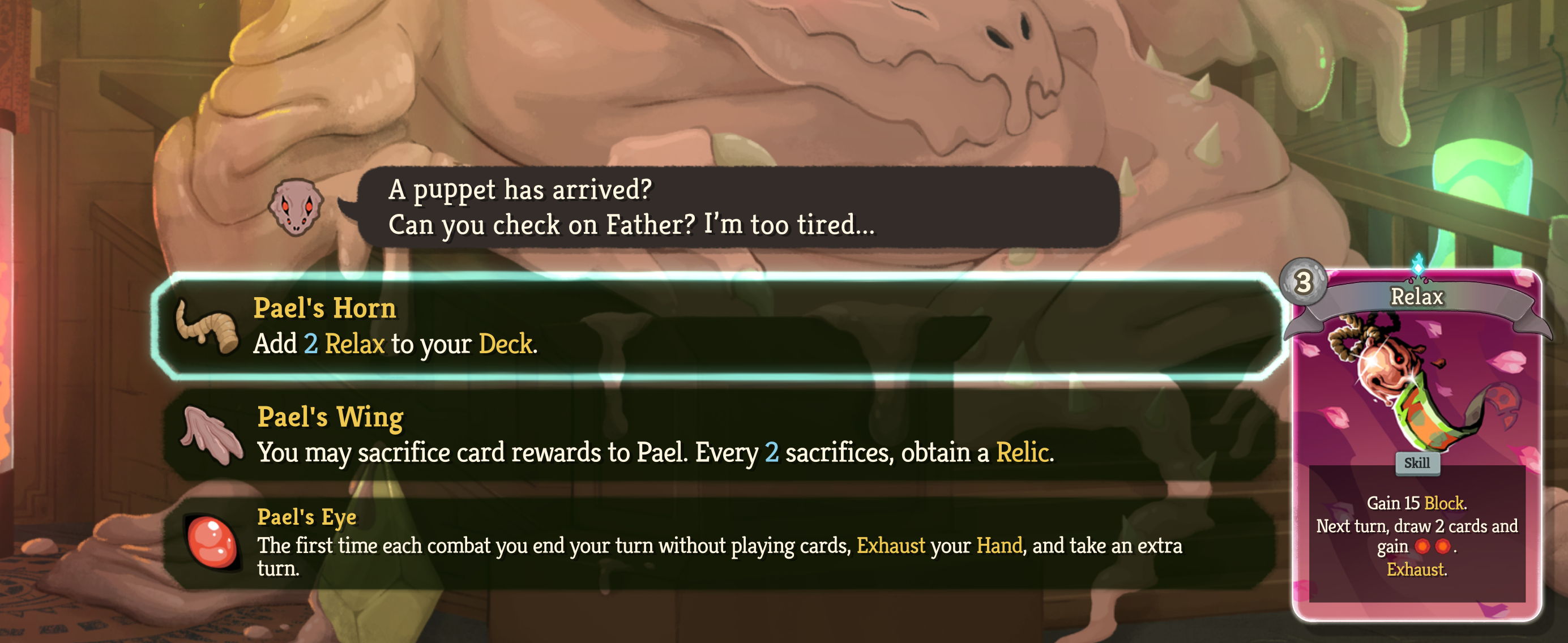 >still can't see upgrades of cards/relics that create cardsbruh it's 2026, common this should have been a feature in STS1Does anyone know what these Relaxes upgrade into? 3 energy is very steep, if it upgraded into 2 i might consider it, otherwise i'm taking the wing. The eye is just too much of a gamble; if i draw my best cards on turn 1, I can't afford to exhaust them; then i get 2 turns with dogshit cards, which doesn't do anything for me.